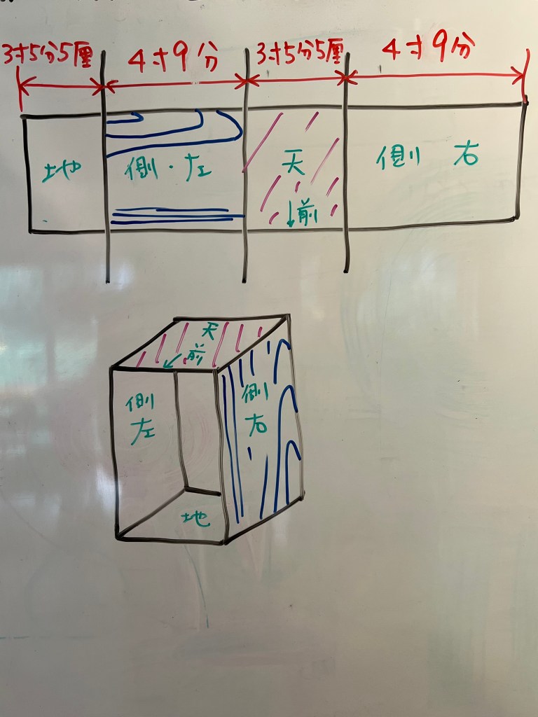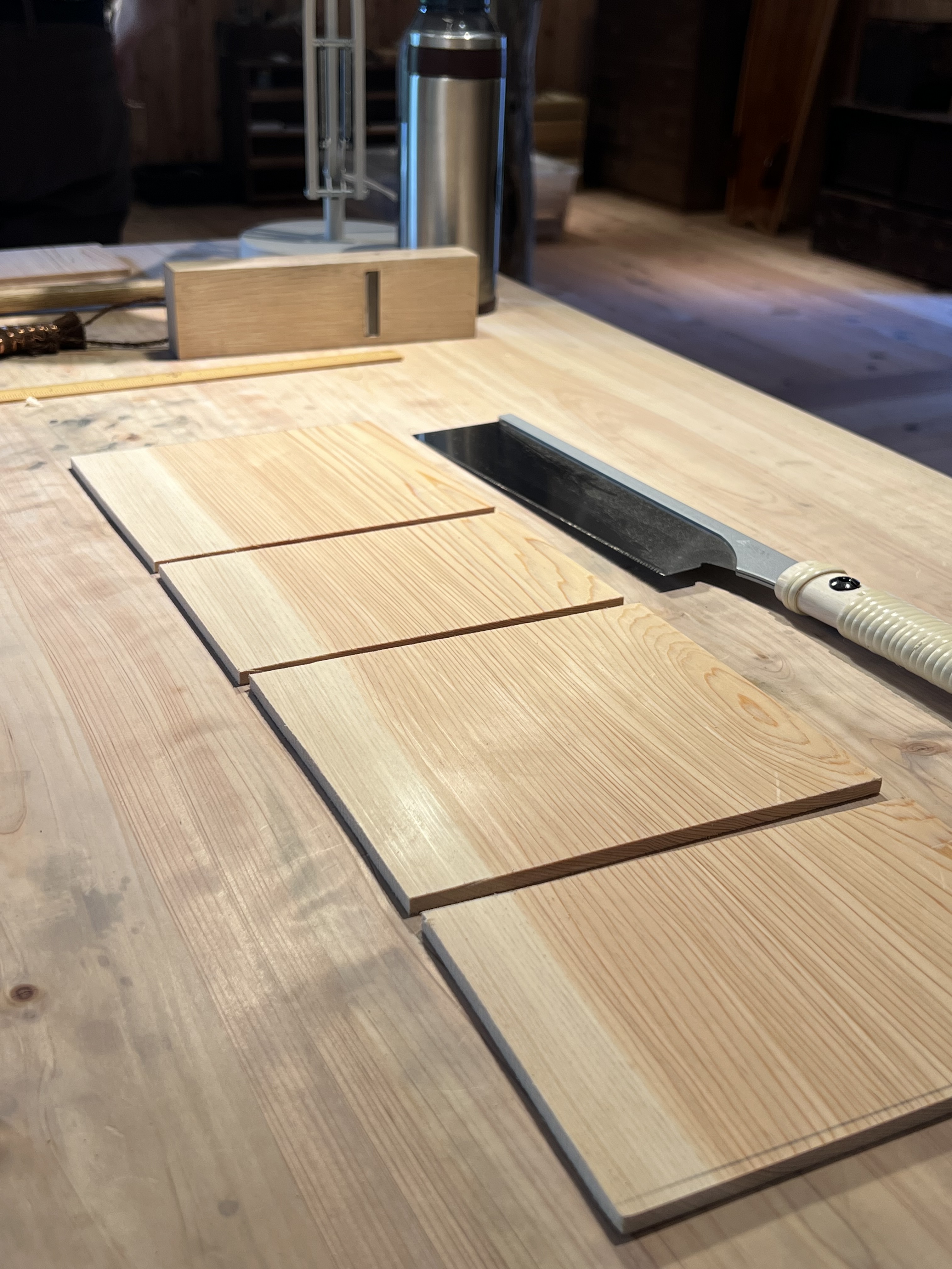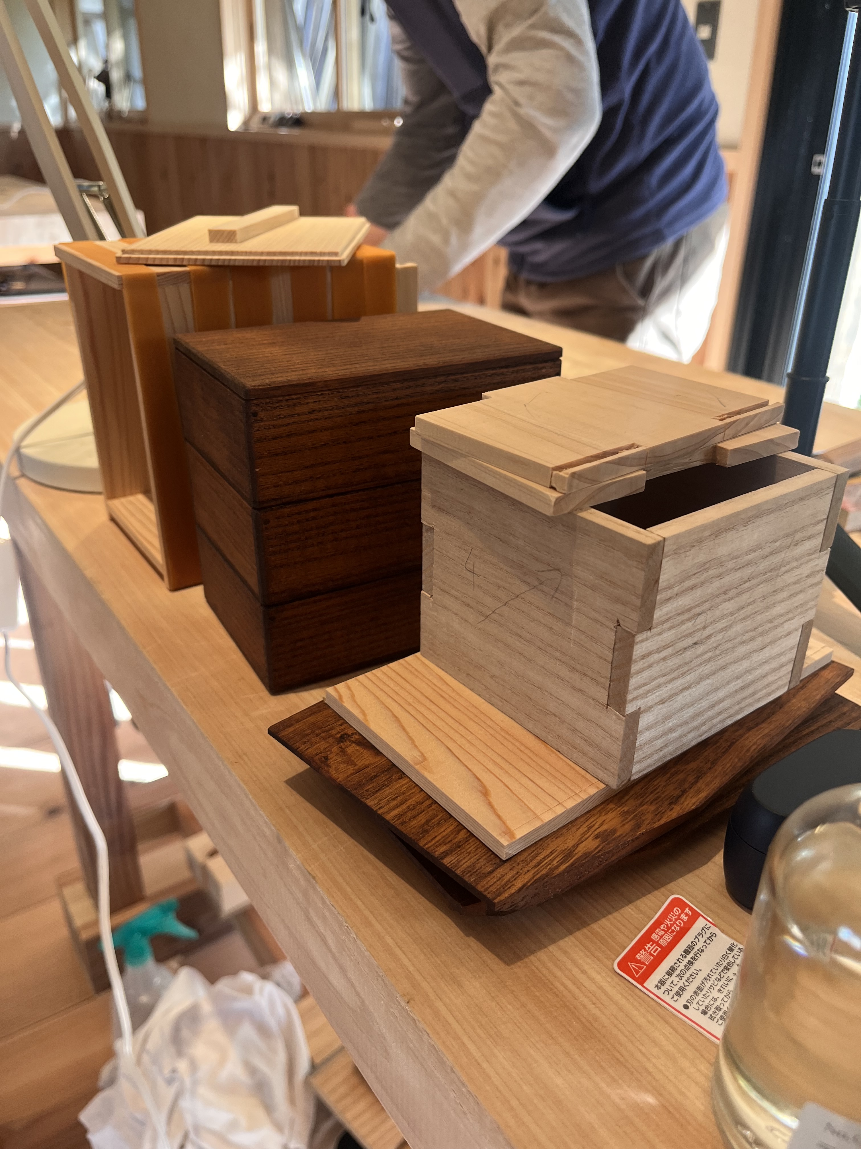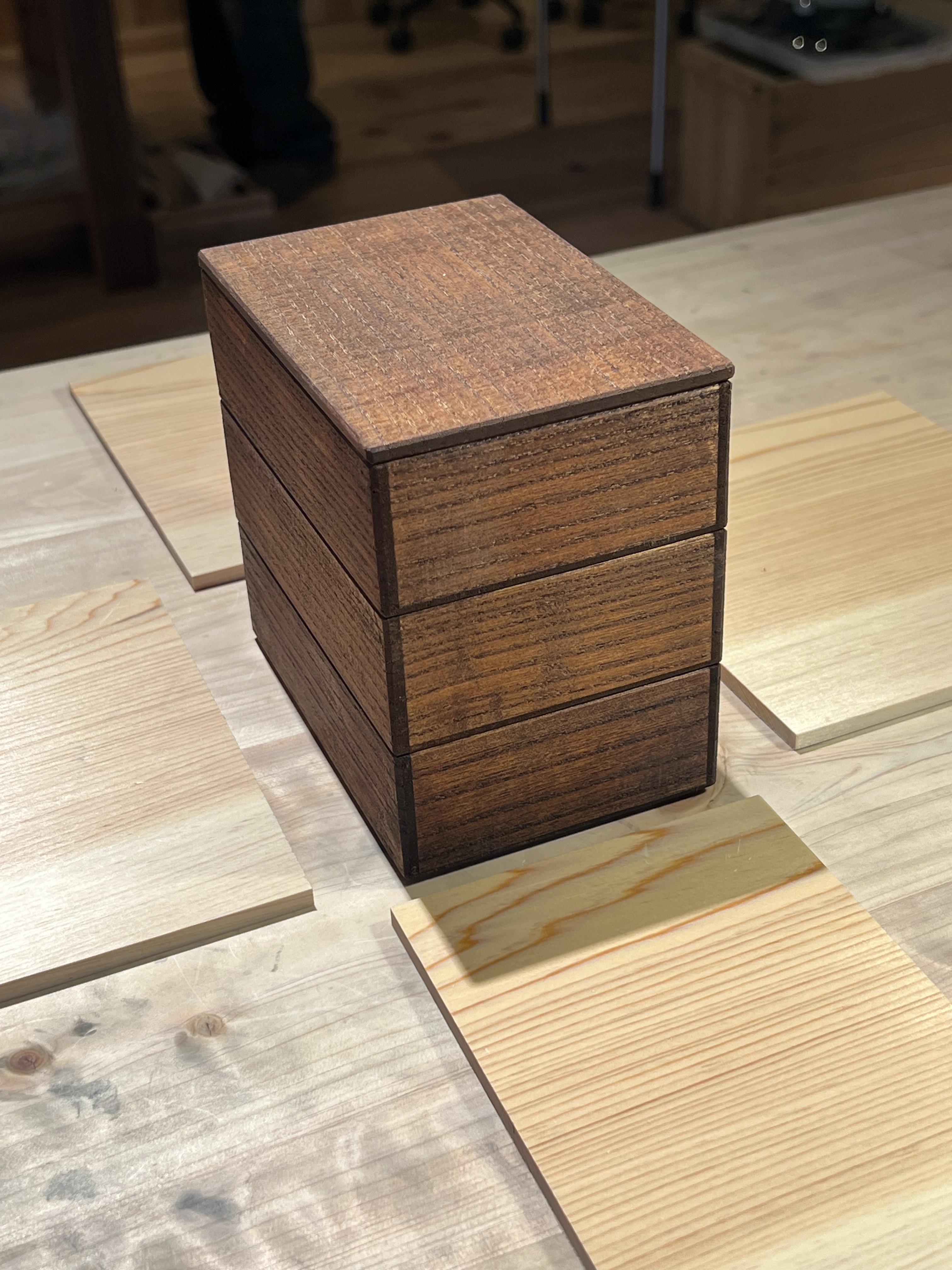 You might notice that the wood above is not Paulownia. Even though I said Paulownia wood is used most often in Kyoto-style sashimono, it’s not the only wood used. You can technically use any wood because sashimono is more of a joinery technique than it is the type of wood being used. The more we narrow things down by function (or location), the more specific we become in choosing the wood. So for example, especially in Kyoto, boxes made to store and protect valuable pieces of teaware are typically made of Paulownia wood, called kiribako. Sometimes the pieces are so valuable, they are stored in boxes within boxes within boxes. Sometimes they are lacquered but most often they are left raw and finished by hand planing or sanding. There are many variations in the lids and joints, shapes and sizes, but in general they all follow the principles of sashimono joinery: precise, tight fitting joints using natural rice glue and hand-carved wooden pegs.