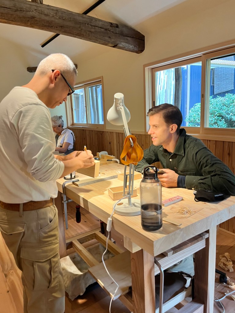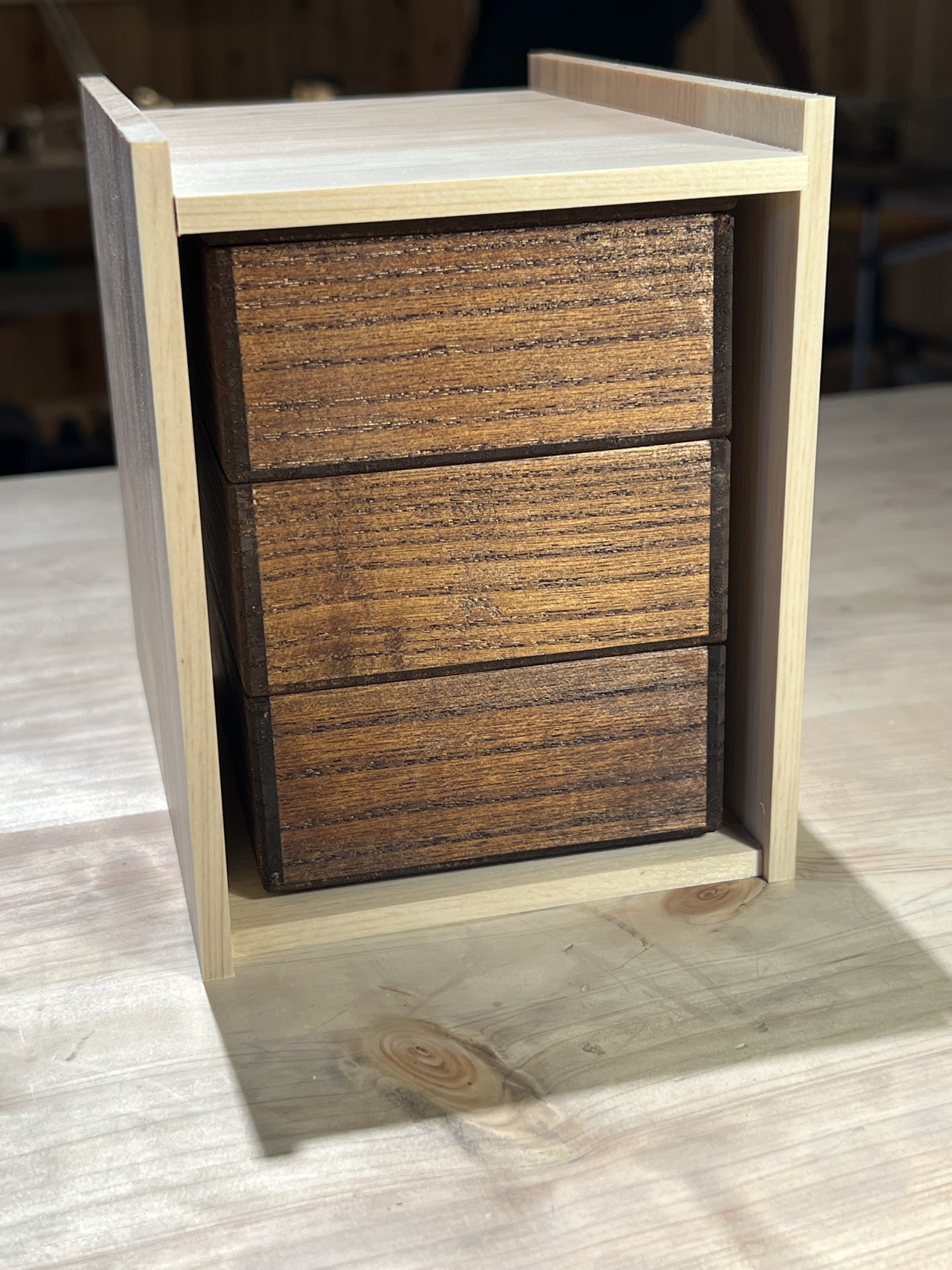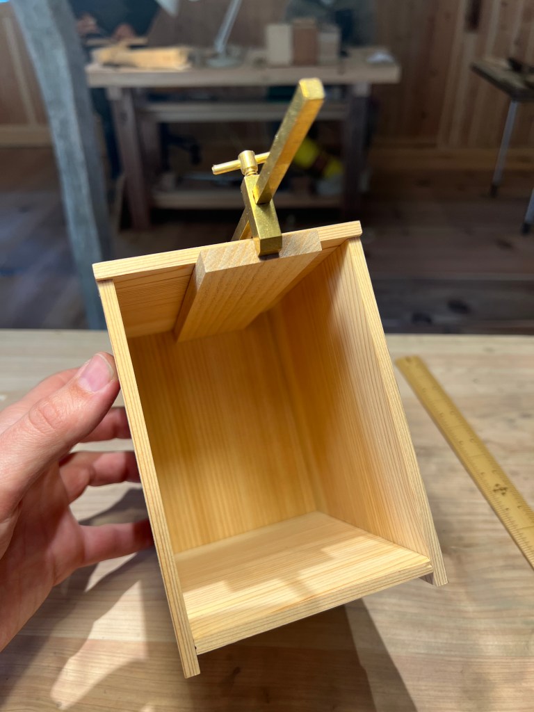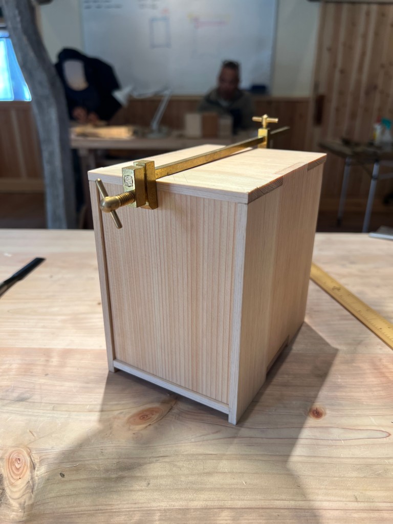 The course is wrapping up fast. There is only one week left and we still have to attach the back panel, adjust the door to fit perfectly, carve and nail in the final wooden pegs, and finish the surface of our Hinoki box. Personally, I am completely ready and excited to tackle the coming week of work.