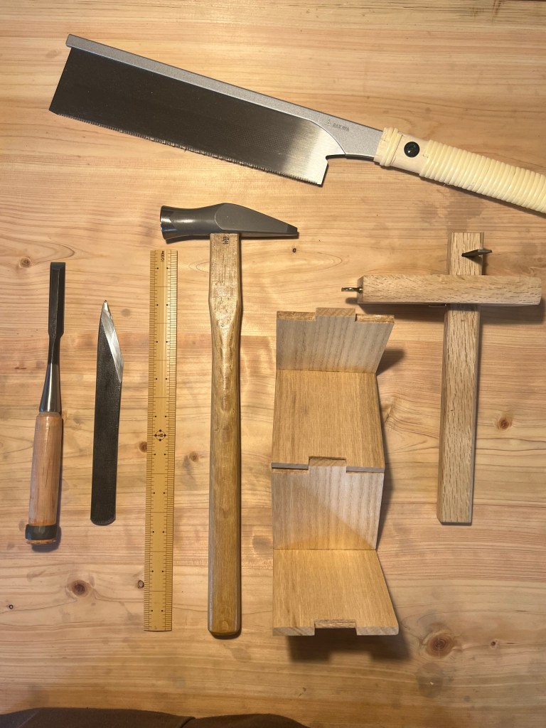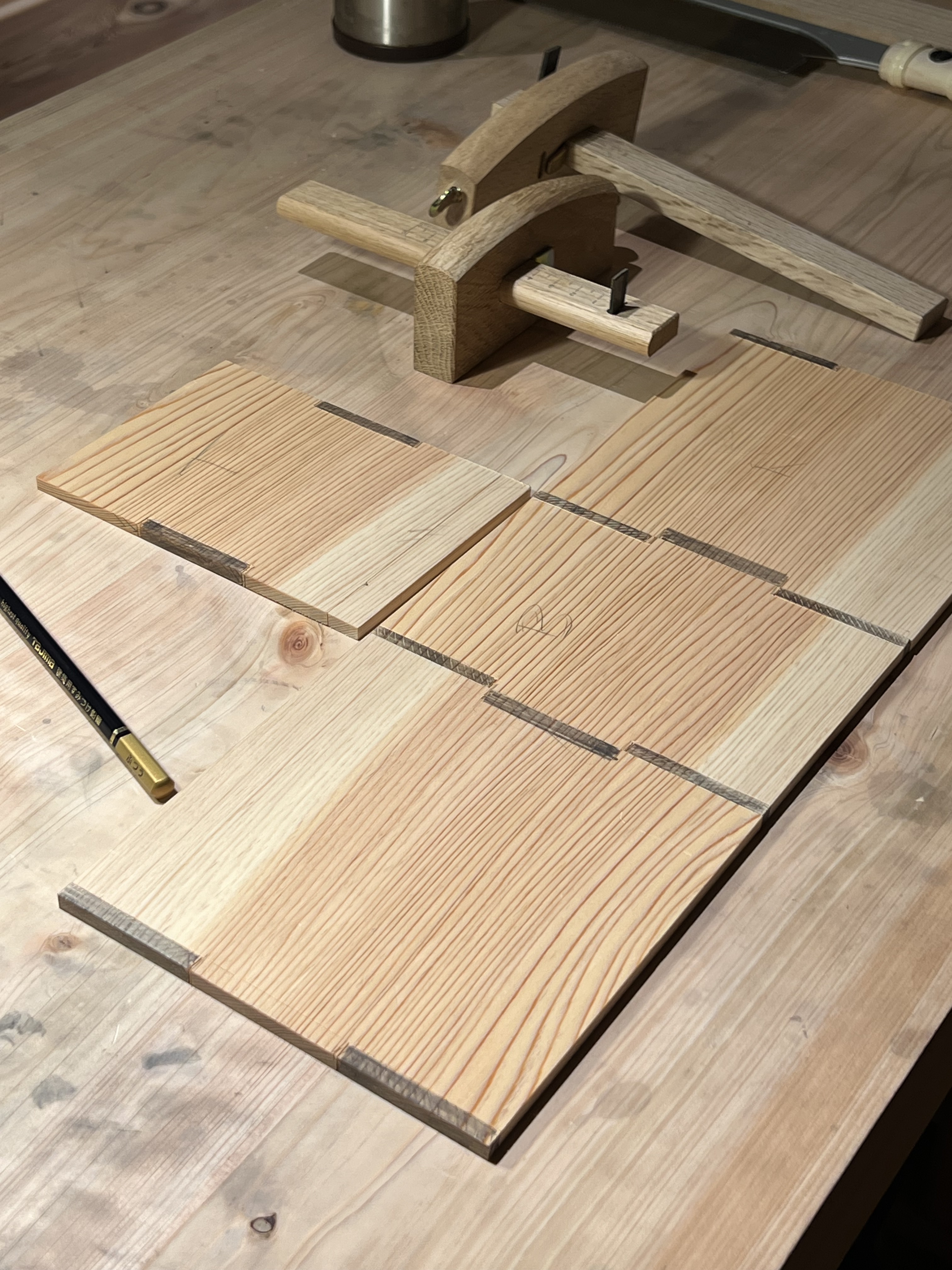 So far, we’ve assembled the interior components of our sashimono project using all of our finely sharpened and honed tools, rice glue, and wooden pegs. I’ve also applied a couple of layers of urushi by this time and I’m astonished by the strength and beauty of these natural elements. But we haven’t cut any joints yet, and because they are going to be such an important and aesthetic feature of our project, we needed to practice on some scrap pieces first!