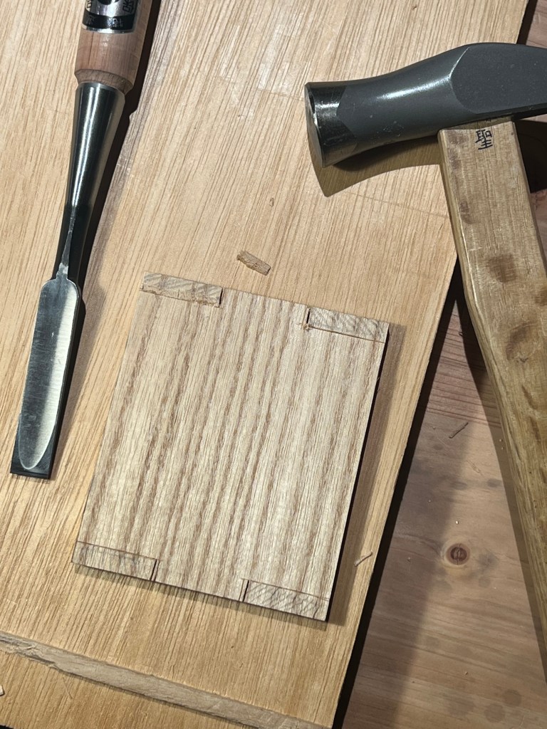 I was surprised to learn how these joints are cut by hand. One tool in particular, the marking gauge, is used in a way I’ve never seen before. I always considered the marking gauge a tool for marking reference lines only, but we are almost using it like a saw to cut an extremely accurately mortise and tenon. Because we sharpened the blade properly, we can cut the fibers of the wood by making multiple passes with the marking gauge. And in combination with our chisel and hammer, we make quick and accurate work of cutting these joints. And because the woods we are using are relatively thin and soft, this technique works perfectly. Even though my joints in the pictures above are rather rough, it taught me the general technique. Now it’s time to work on the real pieces for the project.